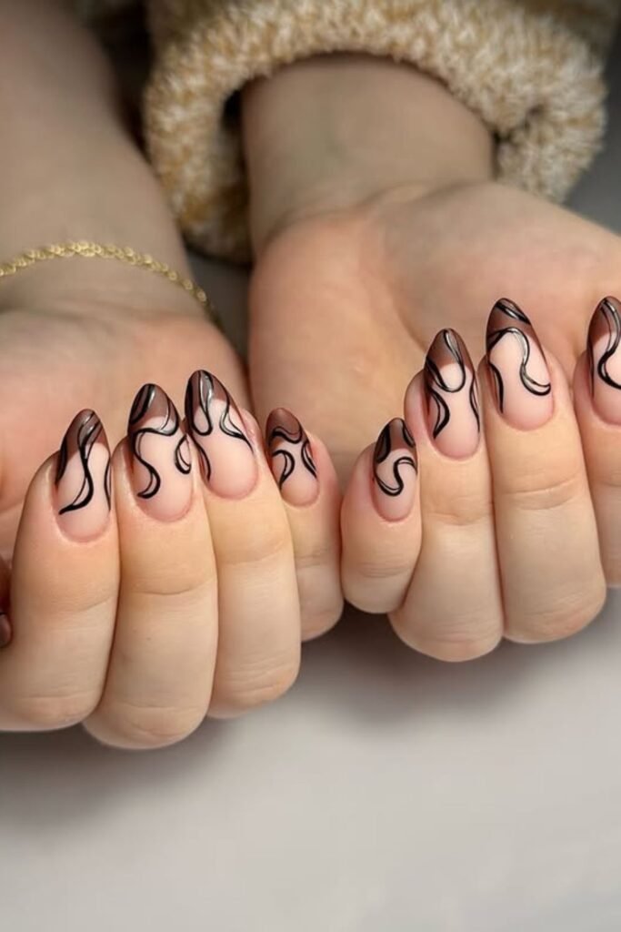 Soft nude nails get a sharper edge when you pull the swirls toward the tip, and this almond set uses that trick in a clean, stylish way.