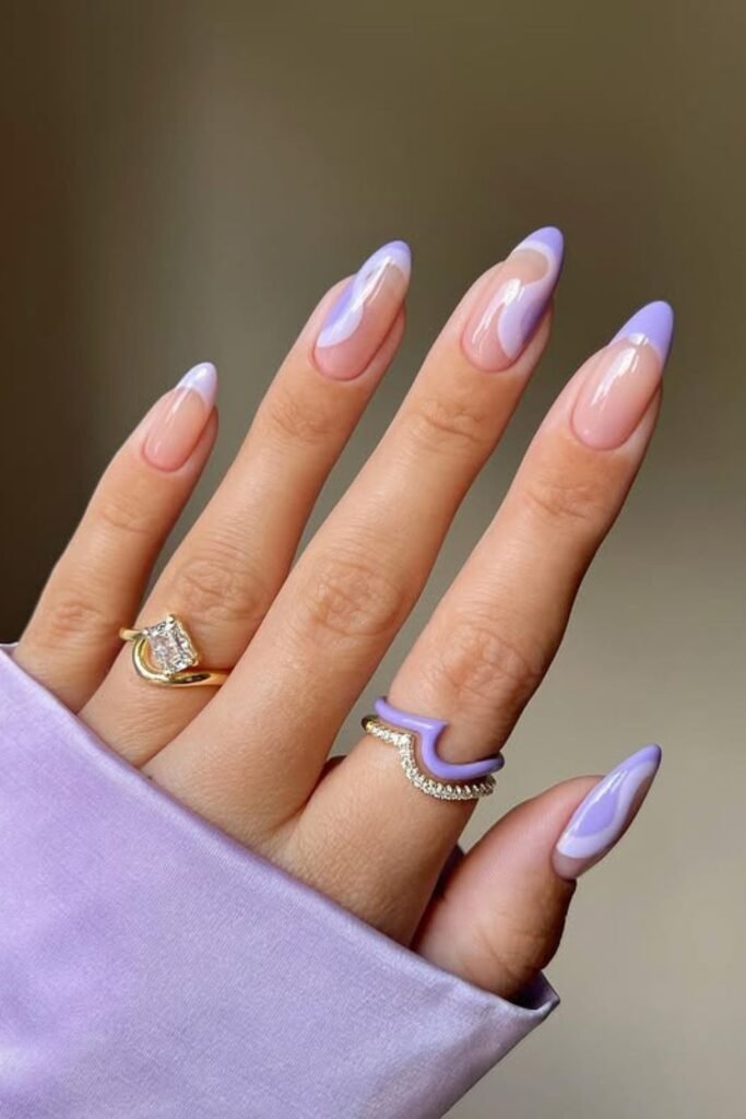 Soft purple always gives almond nails a calm, clean look, and this set keeps the color focused on one side so the nude base stays light and airy.