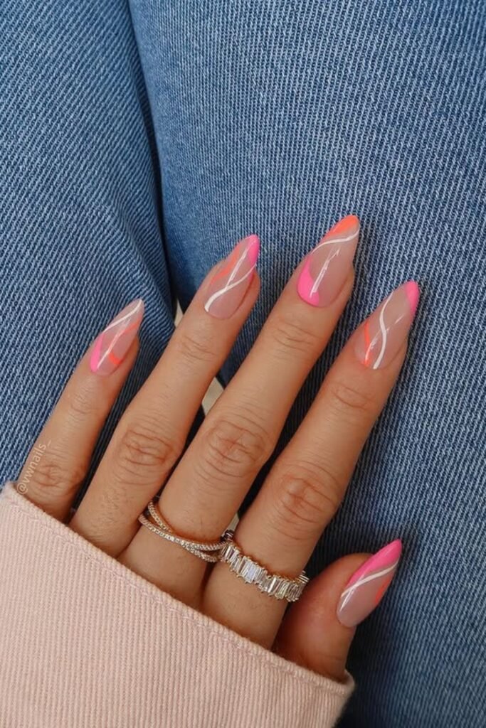 Two tones of pink create a soft but bright swirl pattern here, and the almond length gives those long curves plenty of room to glide down the nail.