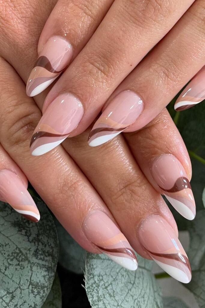 Warm browns and crisp white always pair well on almond nails, and this set keeps the colors layered neatly along the tips so the nude base stays clean.