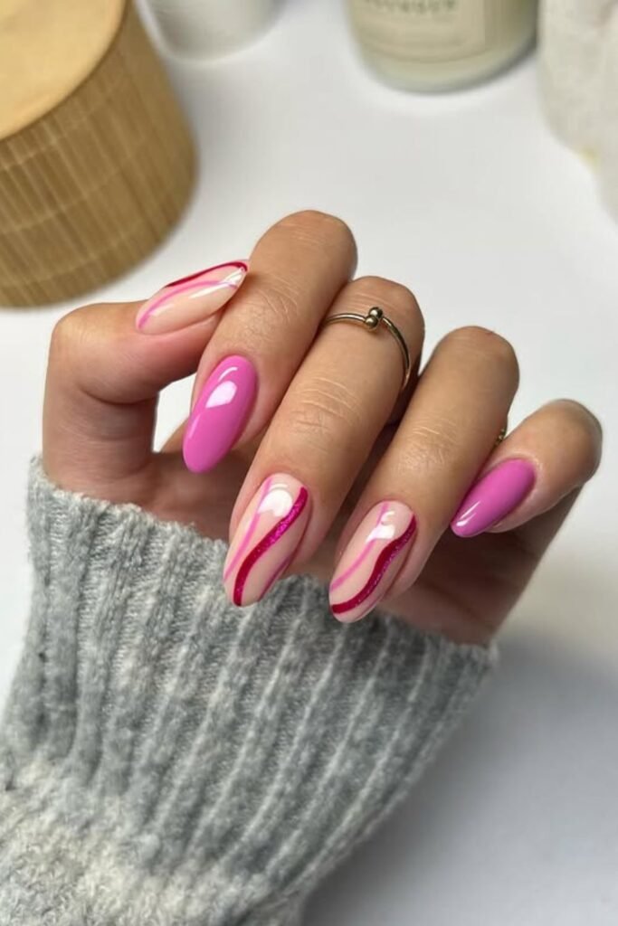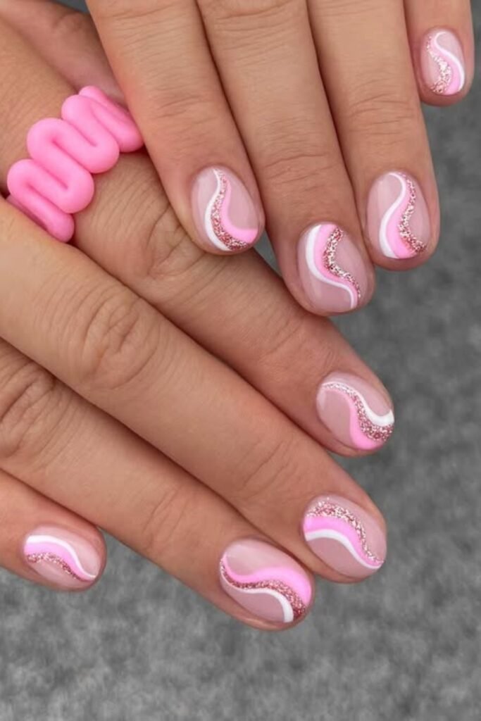 The soft pink base keeps everything soft, and the bright pink and white curves make a layered look that looks good on shorter nails because the lines stay neat and tight.