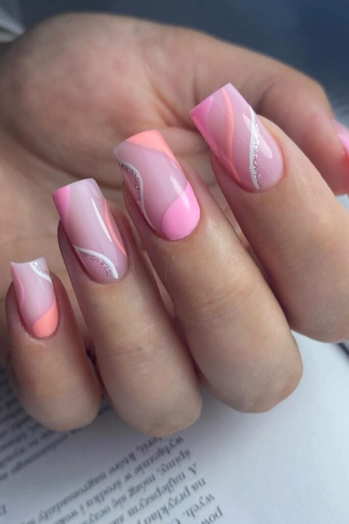 Blending different pink tones works well on longer square nails, and this set uses wide curves to keep the colors looking smooth instead of busy.