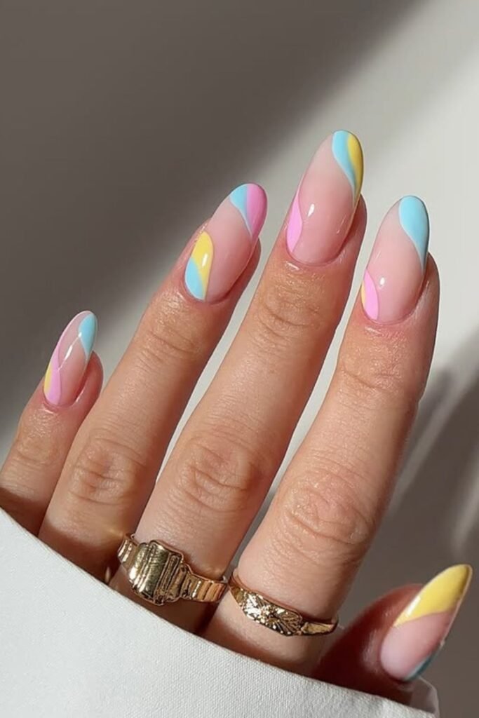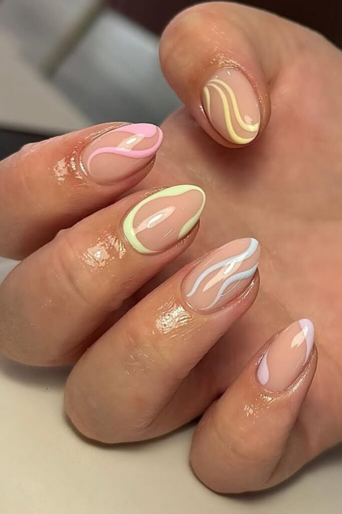 Soft curves in pastel shades give this set a calm, dreamy feel that works for anyone who wants swirl nails without going bold.