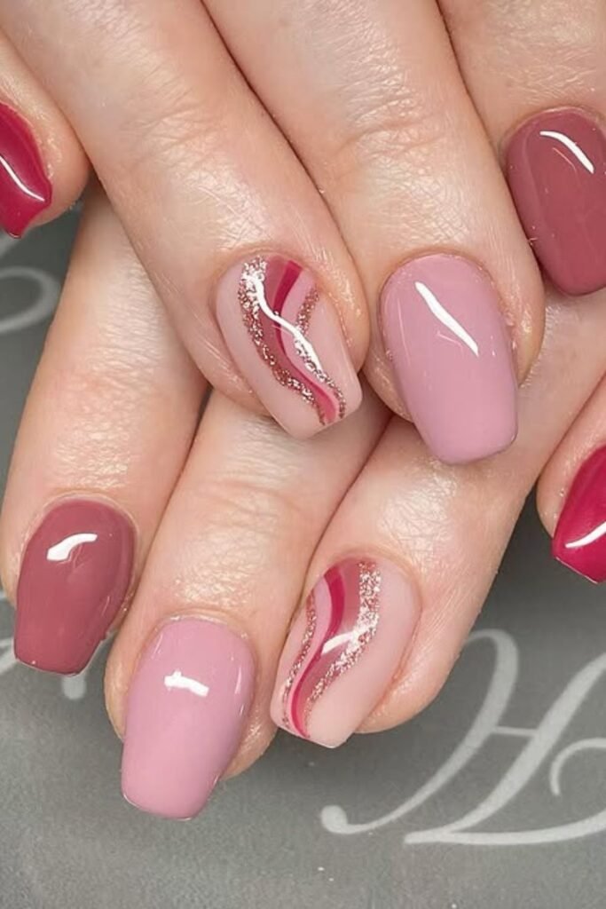 Rich rose shades mix smoothly here, and the swirl nails become the center of attention without overpowering the whole set.