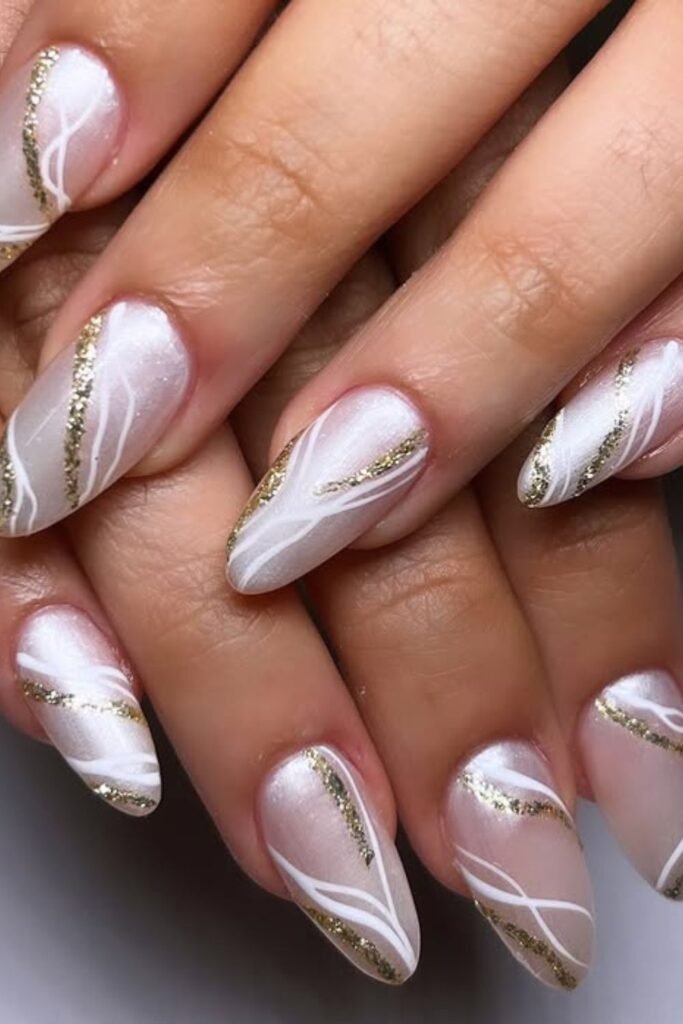 Soft pearl-white polish creates an elegant base here, and the swirl lines give it just enough movement to keep the design fresh.