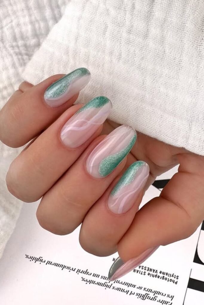 A delicate nude base sets the scene for gentle swirls, and the green shimmer brings a fresh, cool glow to the whole design.