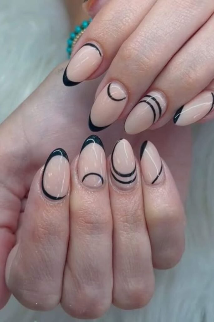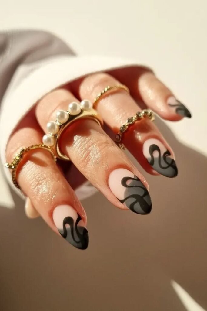 Sharp contrast always works when you want a swirl design that feels bold, and this almond set uses matte black in a clean, modern way.