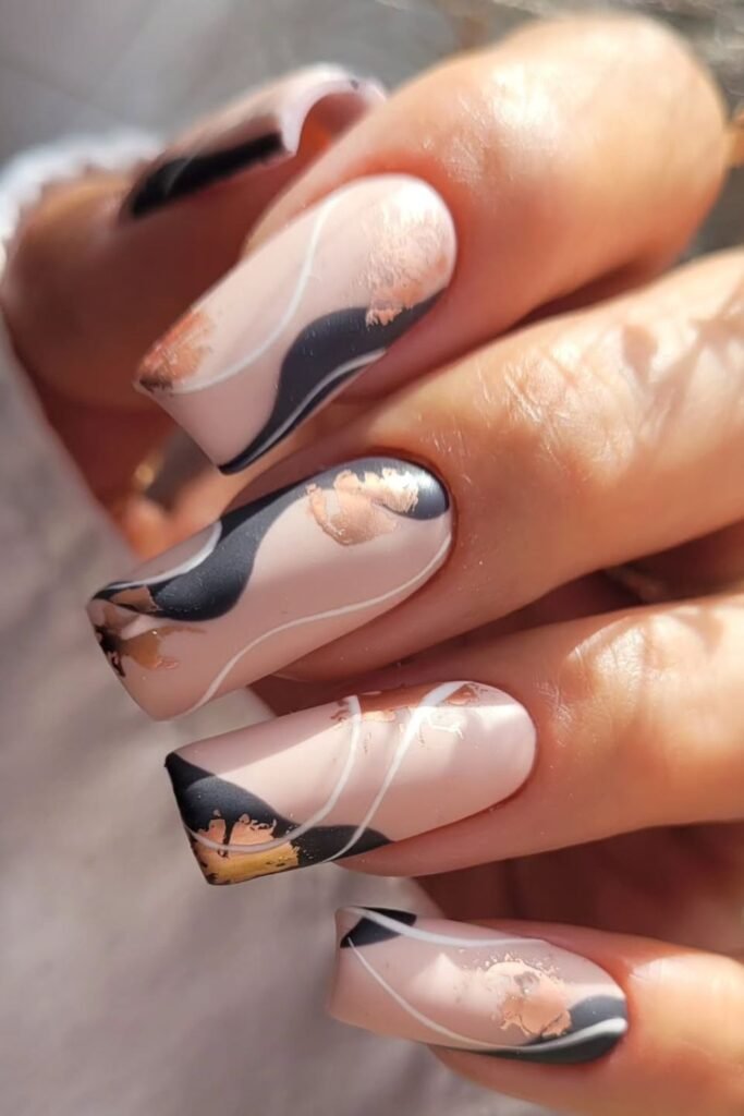 Soft nude nails get a richer feel when you mix in deep black swirls and a few touches of gold foil, and this long square set shows how well that combo works on a bigger canvas.