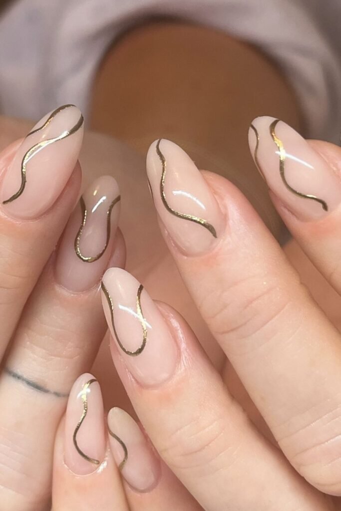 Thin metallic curves always bring a soft nude base to life, and this almond set proves how clean a simple swirl can look when the lines stay fine and even.
