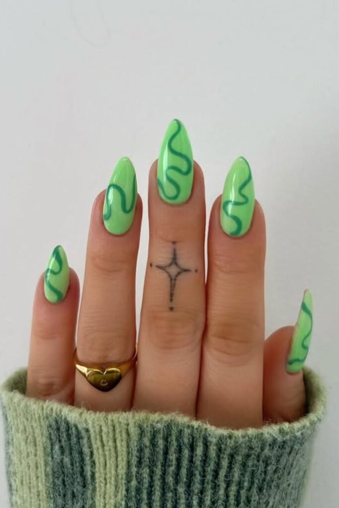 Bright green nails always pull attention fast, and this long almond set makes the swirls feel playful without overdoing the design.
