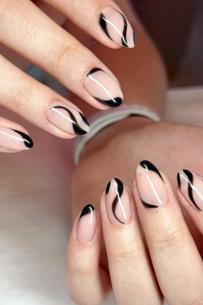 To copy it, start with a sheer nude base, paint your black wave first, and then draw a thin white line next to it to make the pattern sharper.