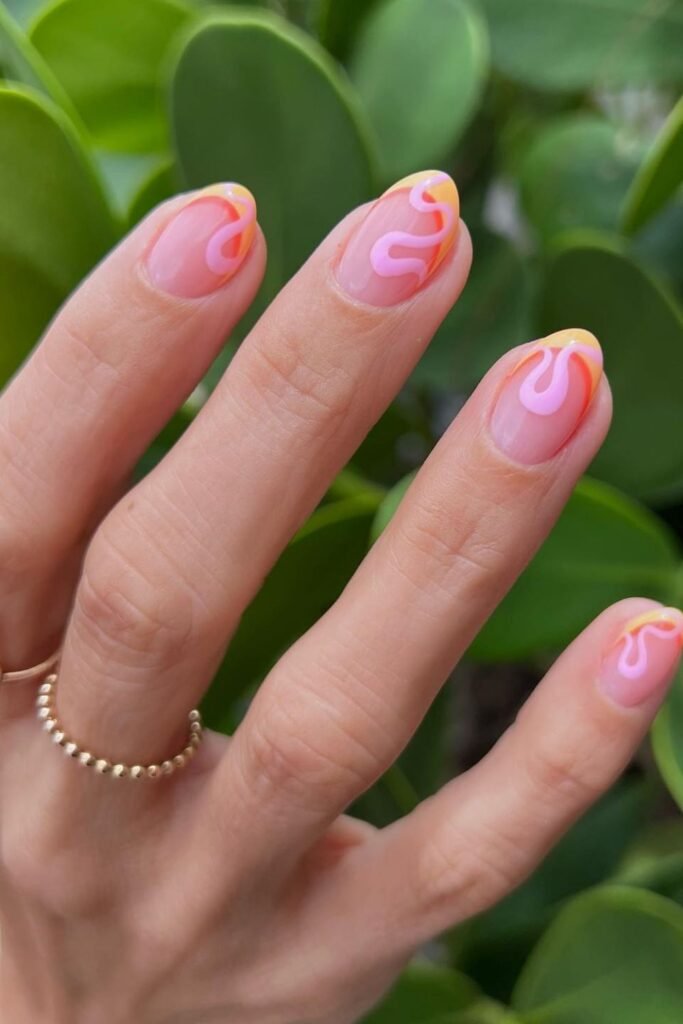 Warm sunset shades always bring short nails to life, and this rounded set uses pink and peach in a soft way that still feels bright.