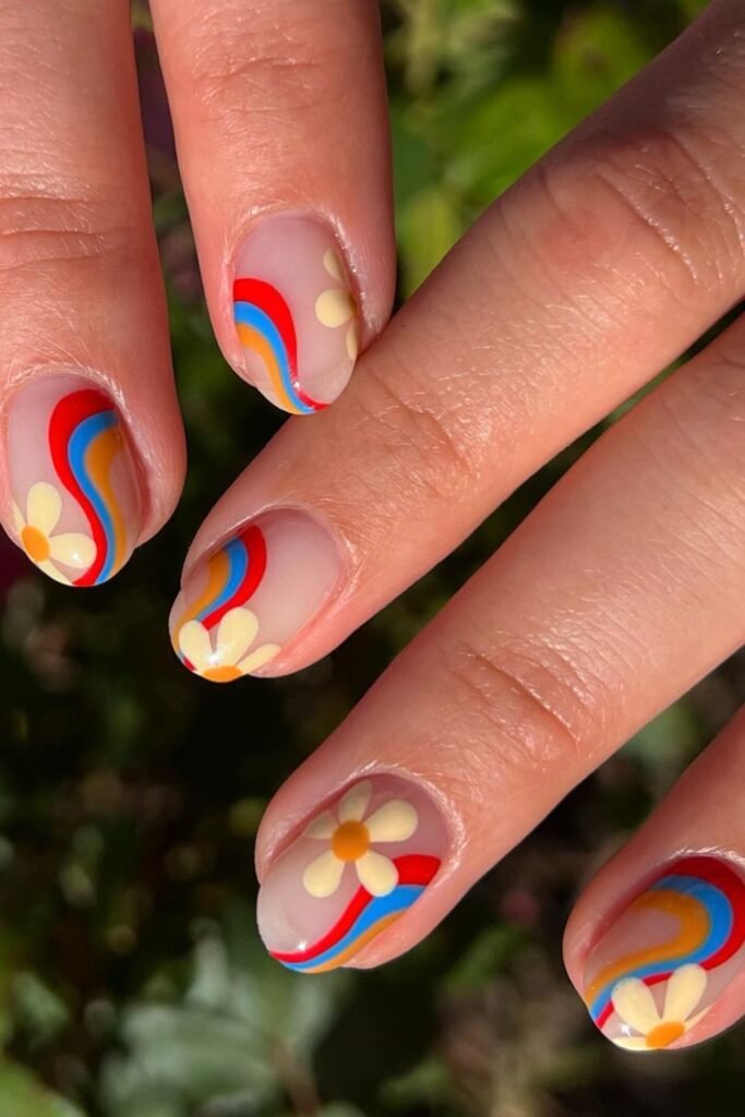 The bright red, blue, and mustard curves that go along each nail look great with the sunny daisy decorations.