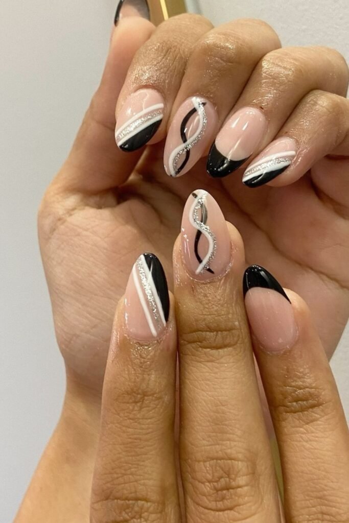 Black and nude nails get a brighter lift when you mix in thin silver lines, and this almond set balances all three shades without making the pattern feel heavy.