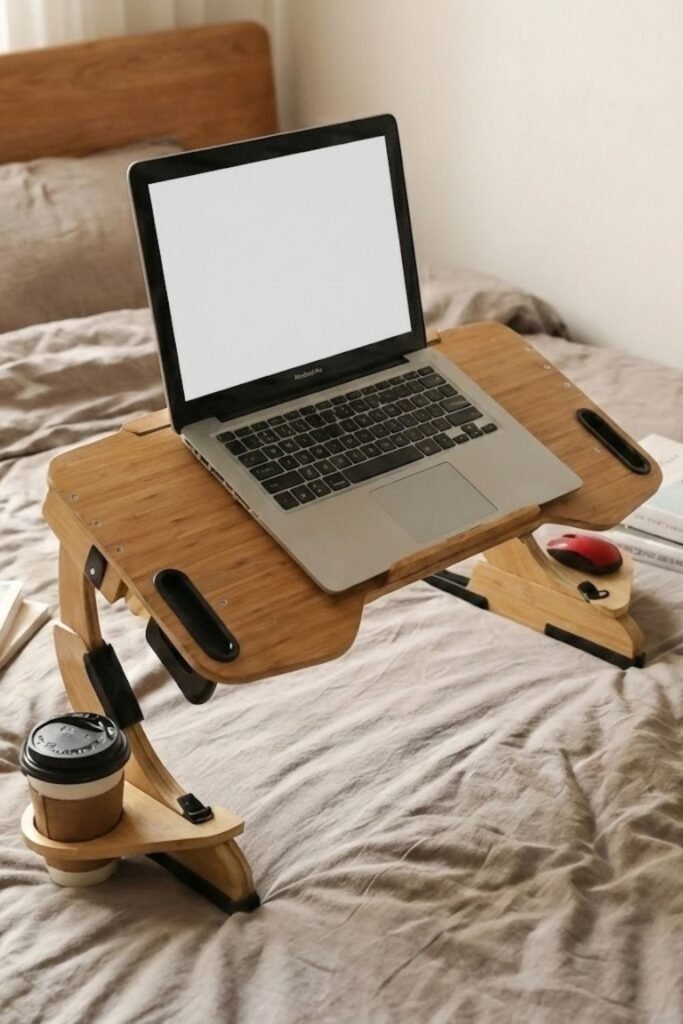 Adjustable bed desks like this lift your laptop to a better height so your neck isn’t bent all day. Built-in cup holders and side slots keep coffee and small items from sliding around.