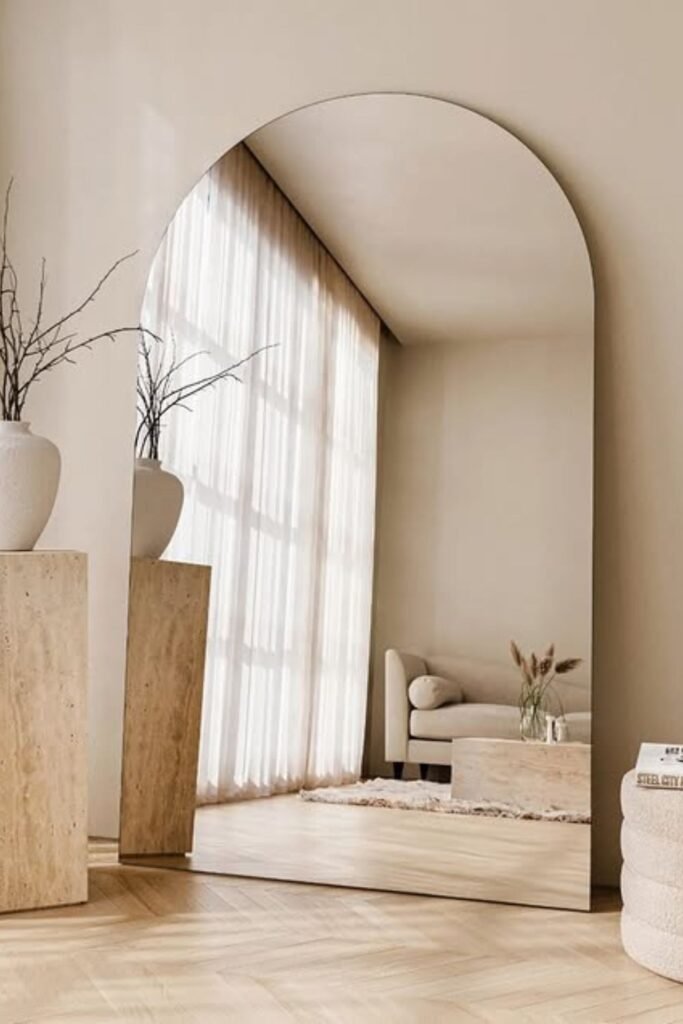 Flat walls feel empty because nothing pulls your eye upward. An oversized arch mirror fixes that instantly.