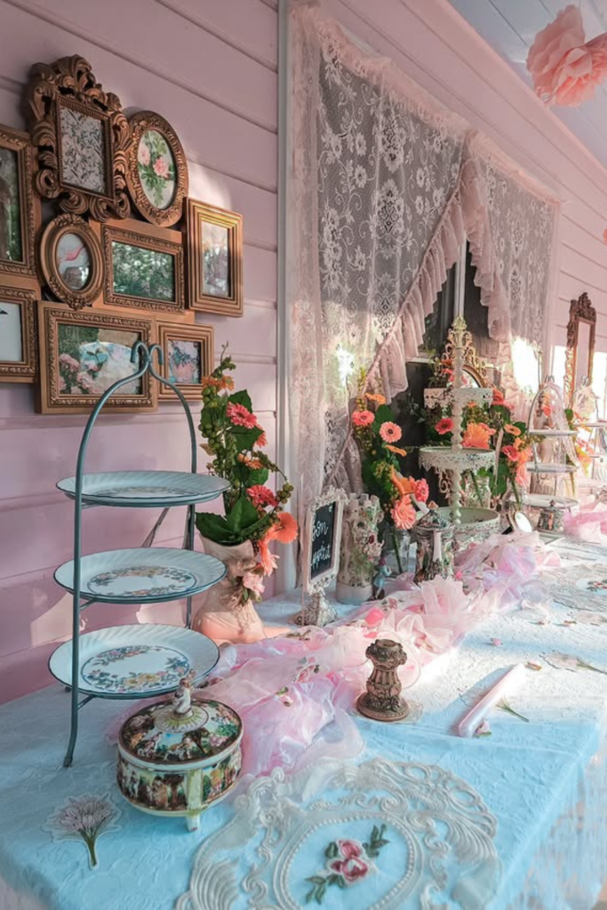 Lace tablecloths, pastel fabrics, framed art, and ornate serving pieces work together to create a cozy, romantic atmosphere.