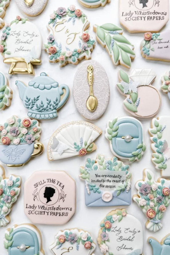 Shapes inspired by bows or teacups clearly signal the tea party vibe while keeping things lighthearted.