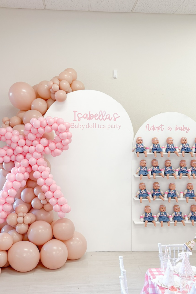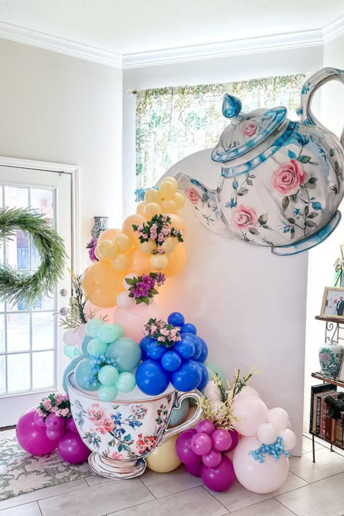 A layered backdrop with greenery, soft balloons, and a focal sign instantly gives the tea party structure and personality.