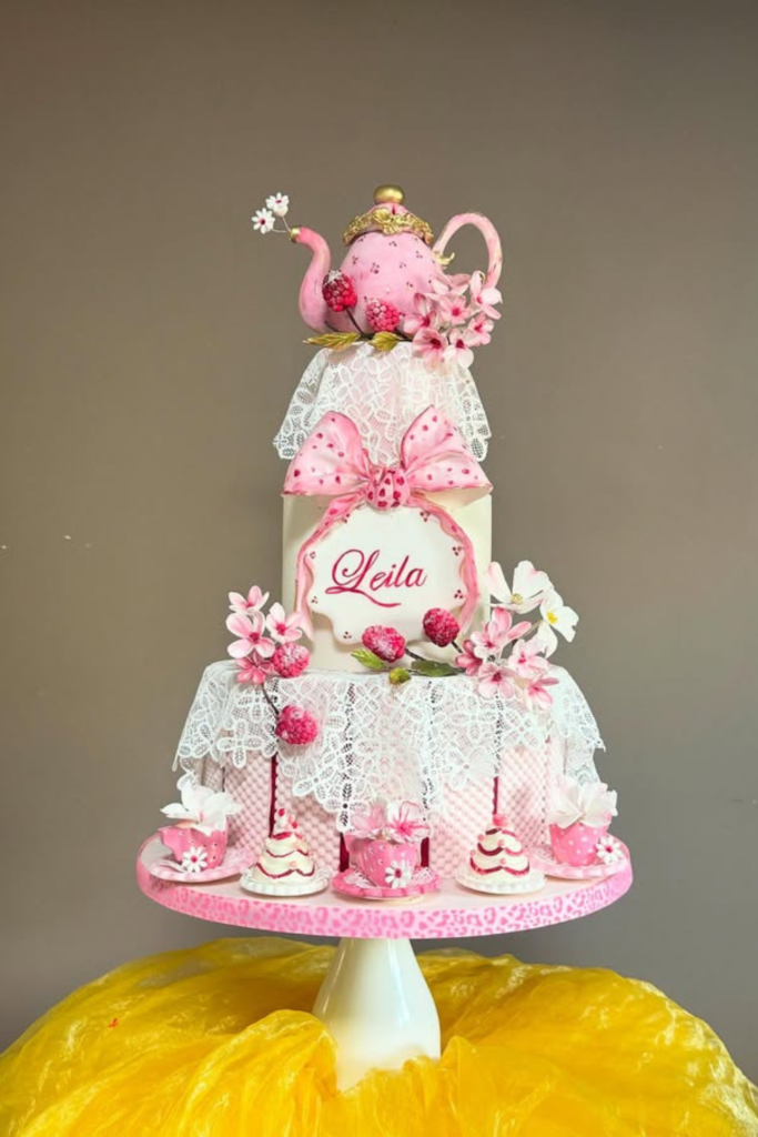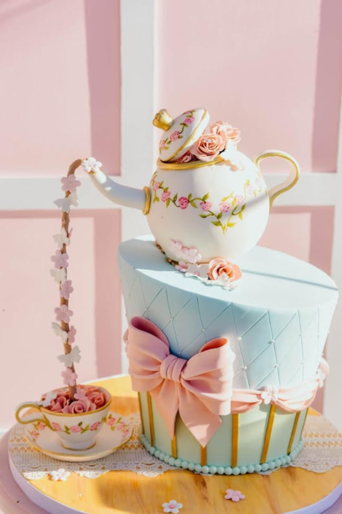 A teapot-inspired cake blends whimsy and elegance in a way that feels perfectly on theme without being childish.