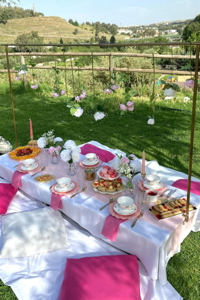 If you want your tea party baby shower to feel soft and magical, a garden picnic setup does the trick.