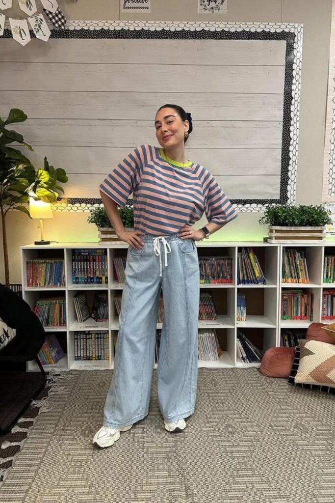 Tuck a loose striped tee into drawstring wide-leg jeans for a relaxed and easy outfit on casual teaching days.