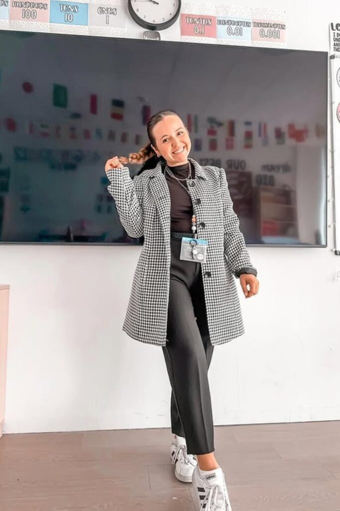 White sneakers make the outfit practical for long hours in the classroom, and soft waves in your hair add a polished touch.