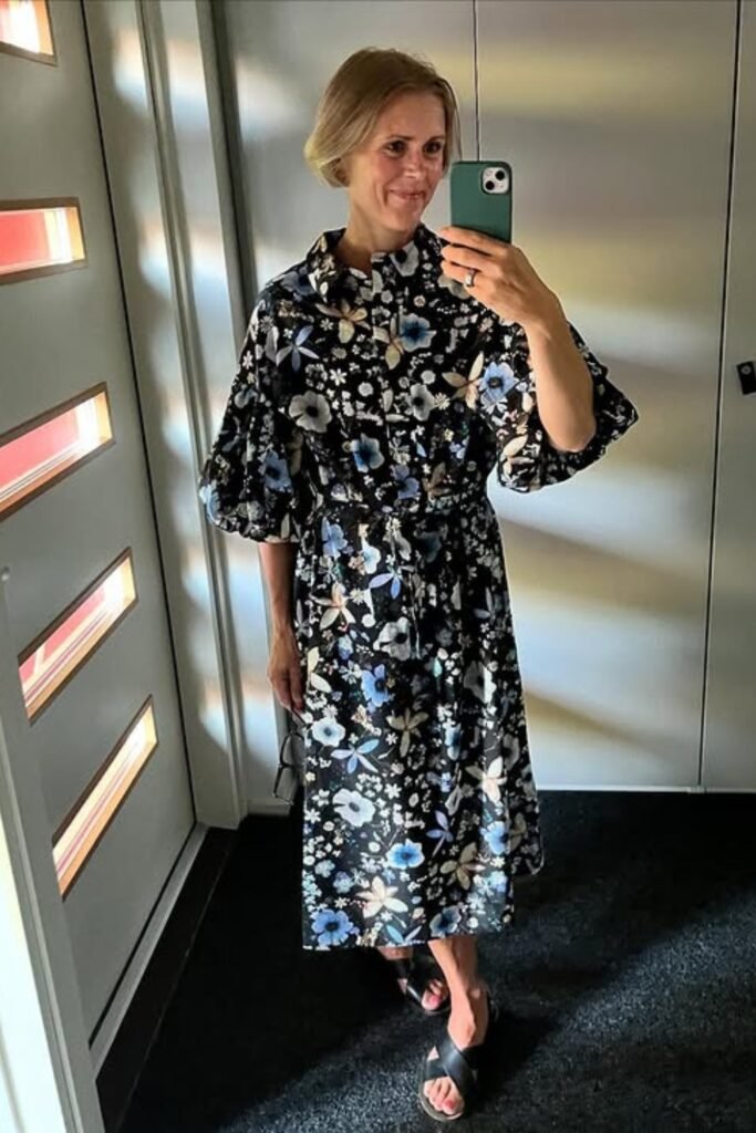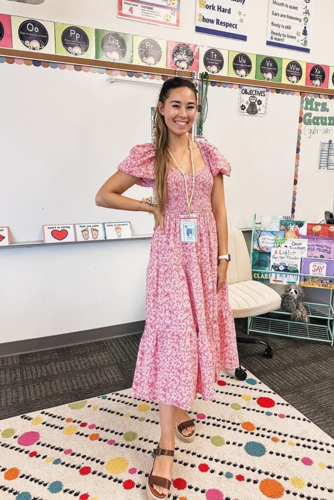 A pink floral midi dress with puff sleeves is a cheerful and stylish choice for the classroom.