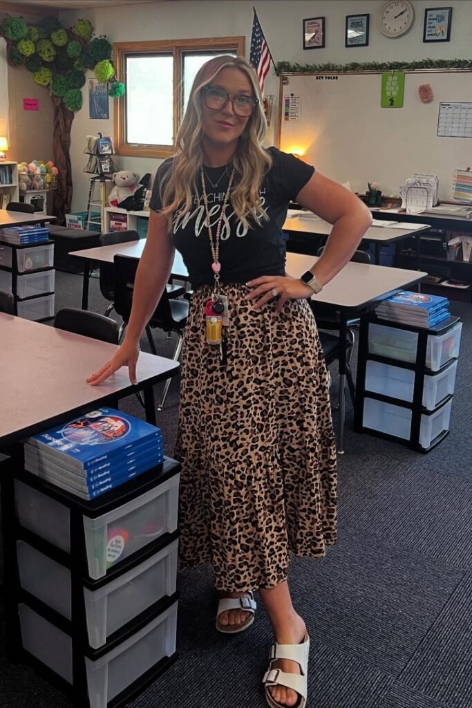 Tuck a black graphic tee into a leopard maxi skirt for a bold and stylish classroom outfit.