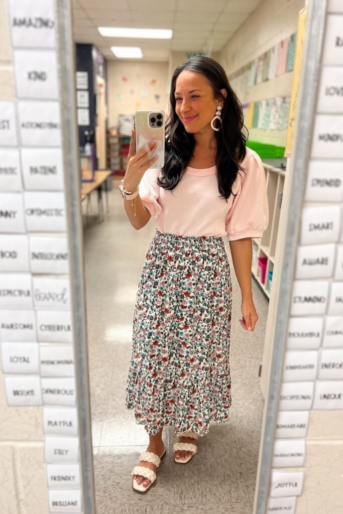 A soft pink puff sleeve top tucked into a floral midi skirt creates a look that is both feminine and perfect for the classroom.