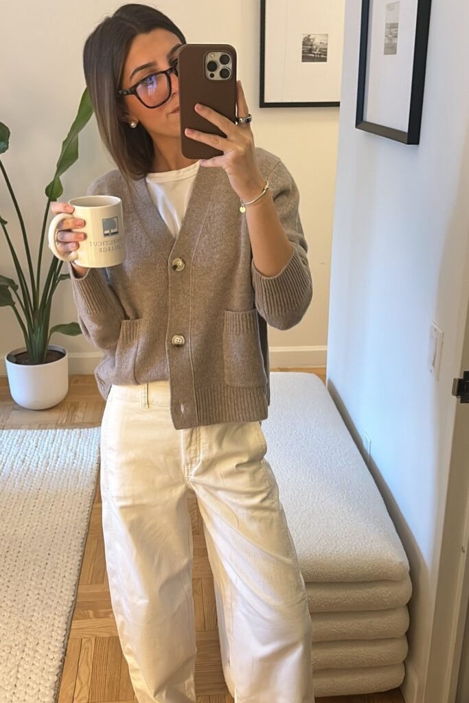 Neutral Cardigan with White Pants