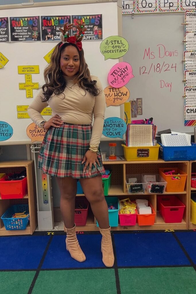 A plaid skirt paired with a tucked-in beige top gives you the perfect mix of fun and professional for those holiday classroom days.
