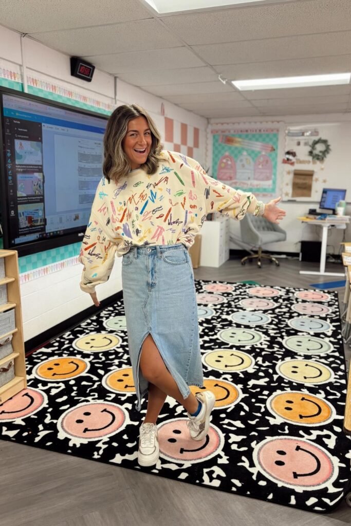 Tuck a fun printed sweatshirt into a light-wash denim skirt for a great casual classroom look.