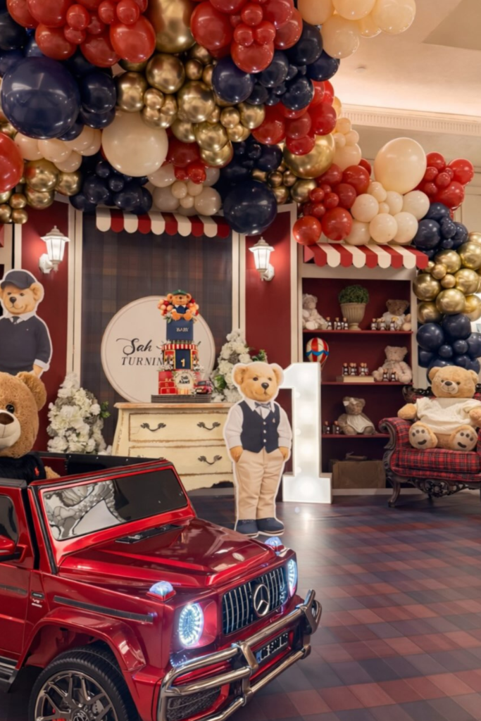 If you like the idea of a playful teddy bear theme, try mixing deep reds, navy, and gold balloons to create a dramatic backdrop.