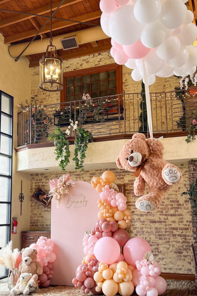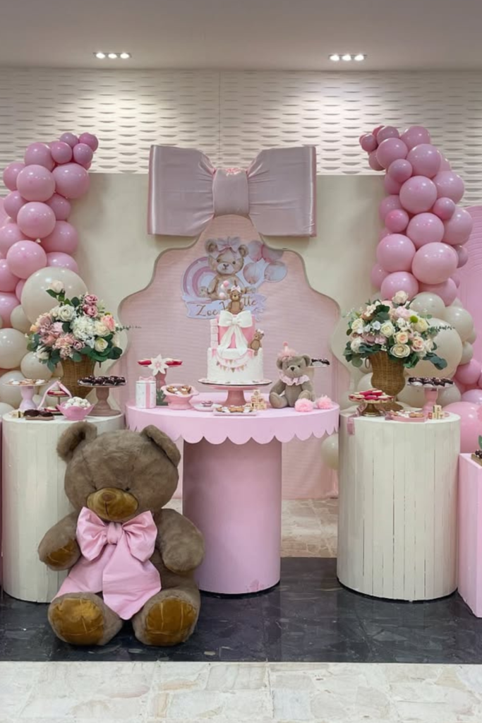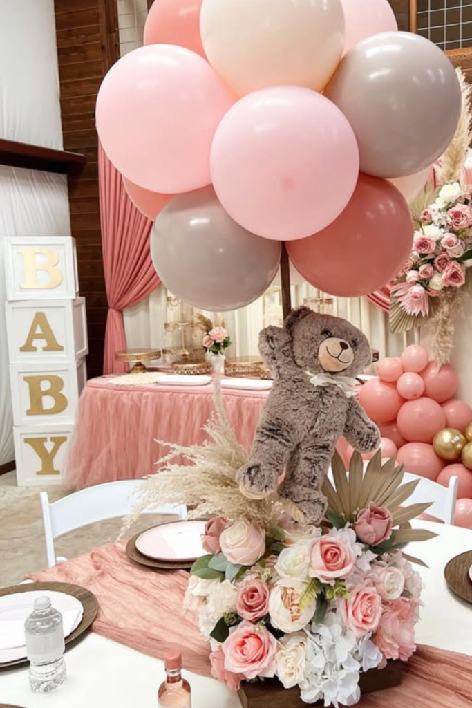 If you’re planning a baby shower for a little girl, leaning into soft pink tones instantly makes the teddy bear theme feel sweet and elegant.
