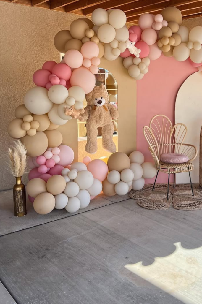 Soft pink, cream, and beige balloons create a warm color palette while the hanging bear adds movement and charm.