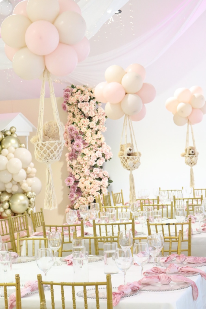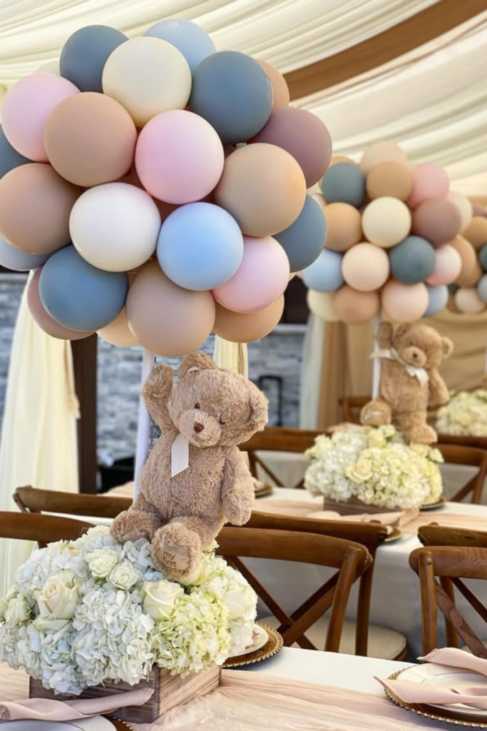 Instead of regular table decor, try creating balloon clusters that sit above small macrame baskets holding tiny teddy bears.