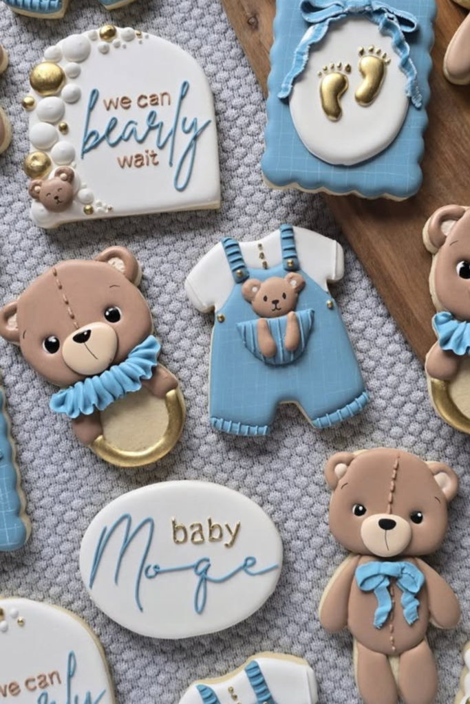 Instead of plain treats, try serving decorated sugar cookies shaped like teddy bears, baby outfits, or little plaques with phrases like “We Can Bearly Wait.”
