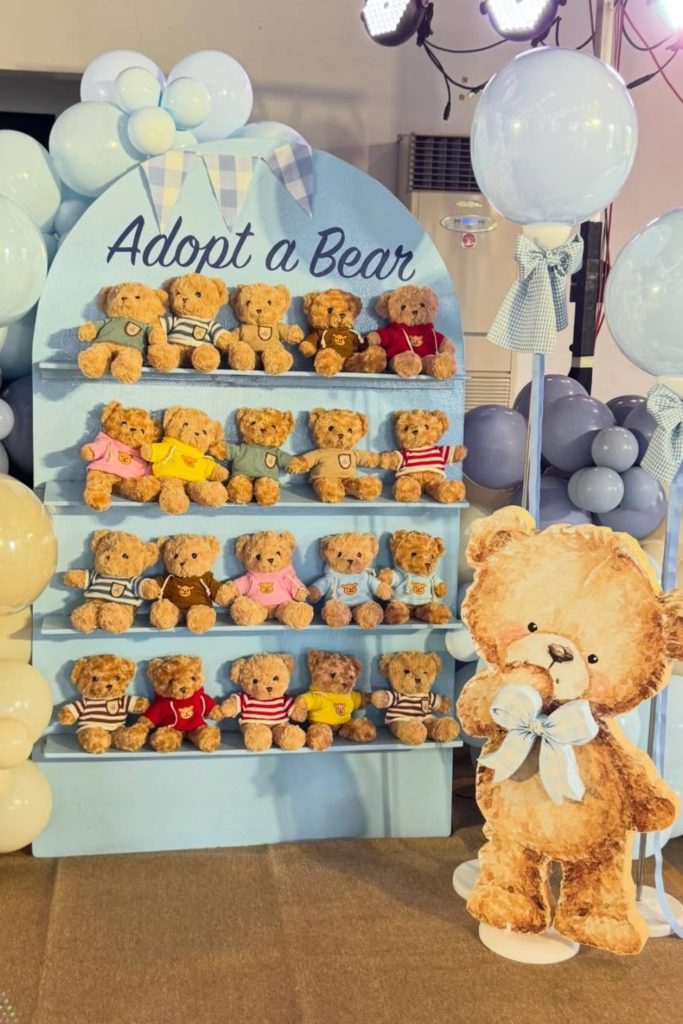 This could be a teddy bear photo backdrop, a swing surrounded by balloons, or even an “Adopt a Bear” station where guests pick a small teddy as a favor.