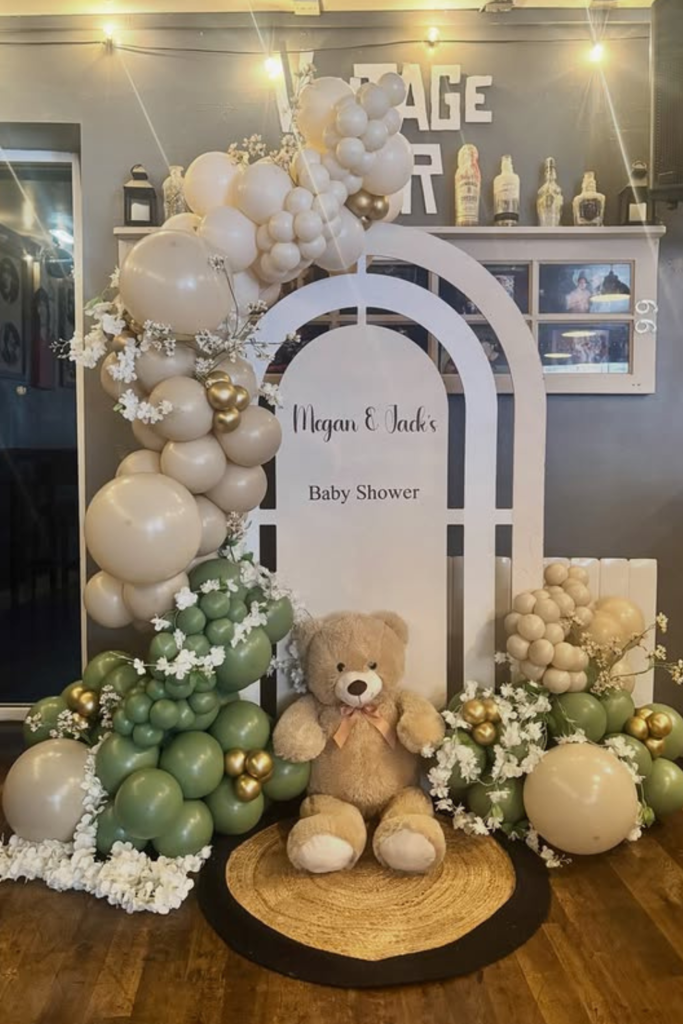 Pair that with soft neutral backdrops, greenery, and a large teddy bear near the stage area to keep everything connected to the baby theme.