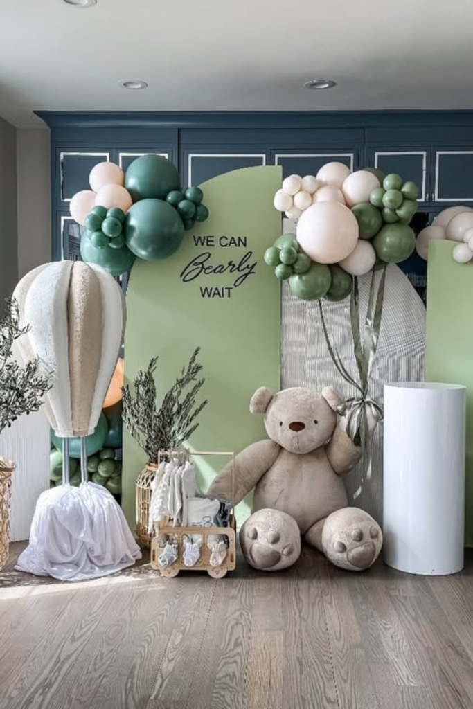 A simple backdrop with a phrase like “We Can Bearly Wait” works perfectly when paired with a large plush bear and a few natural props like woven baskets or greenery.