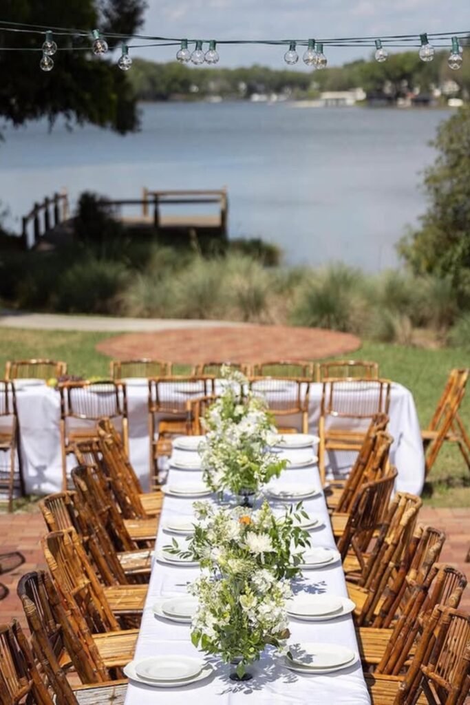String lights overhead finish the look softly, creating evening charm that photographs beautifully year after year.