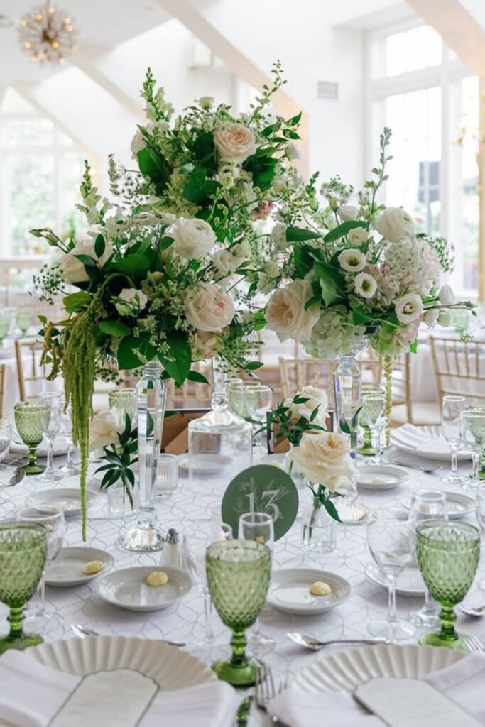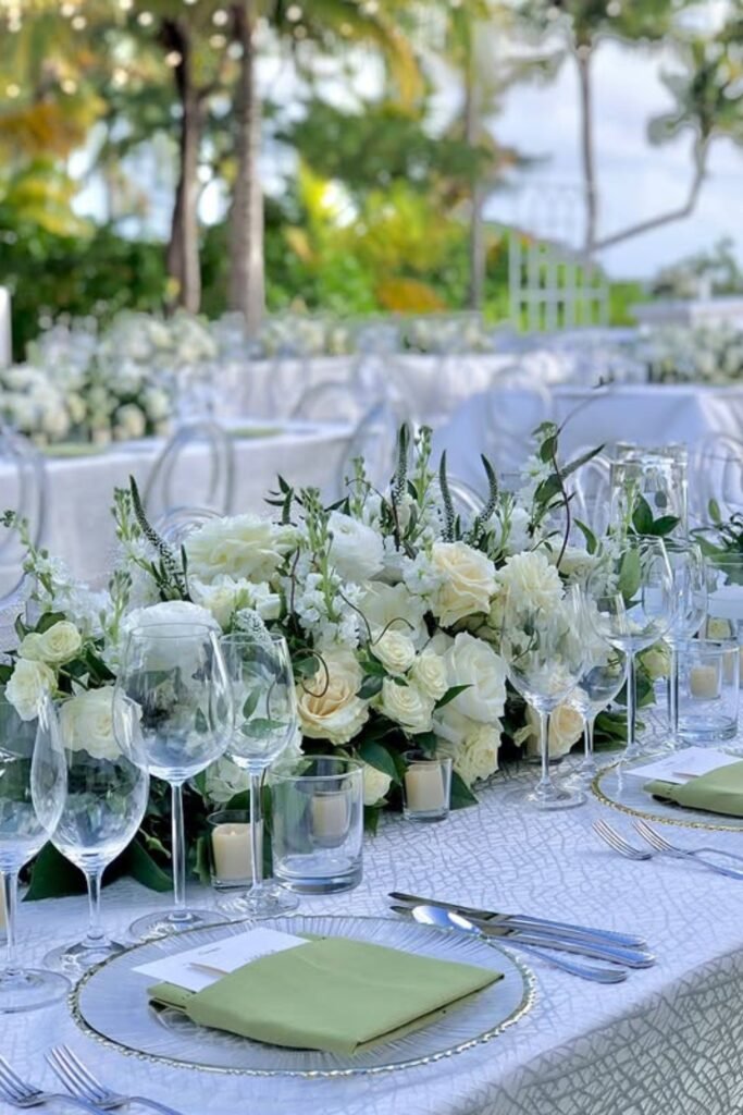 This look works when you want warmth without trends, using greenery and white florals to soften long tables in a natural, timeless way.