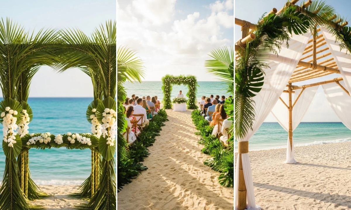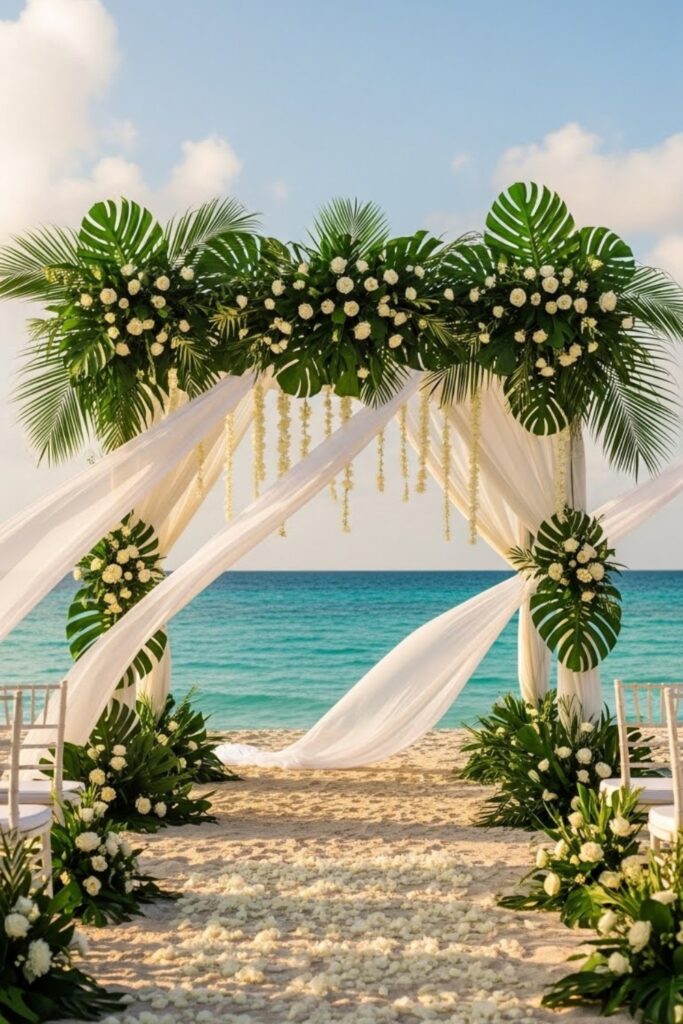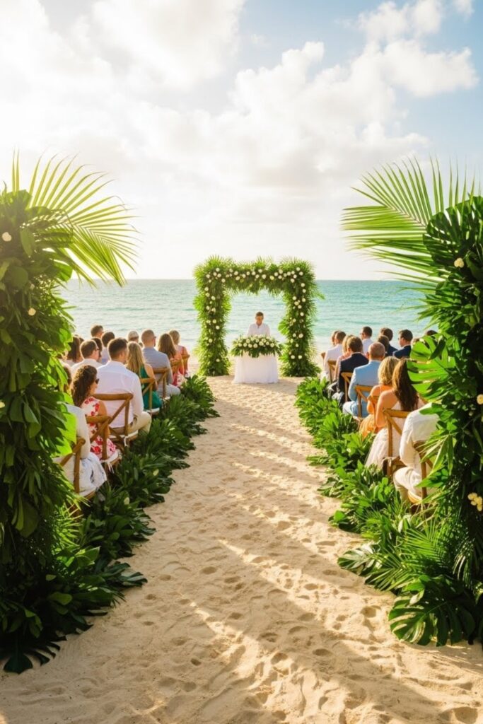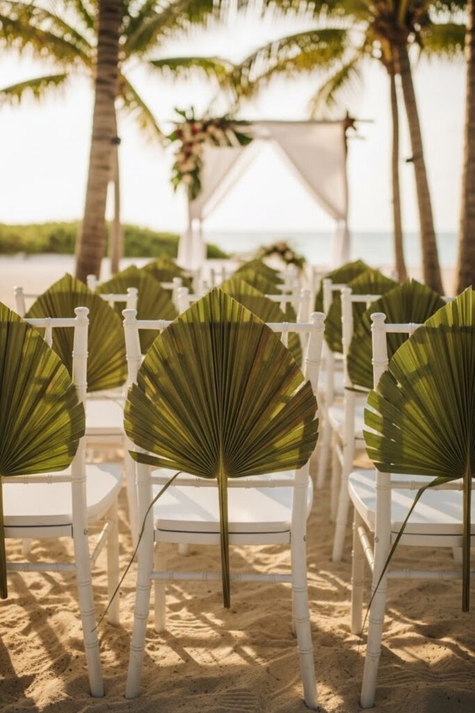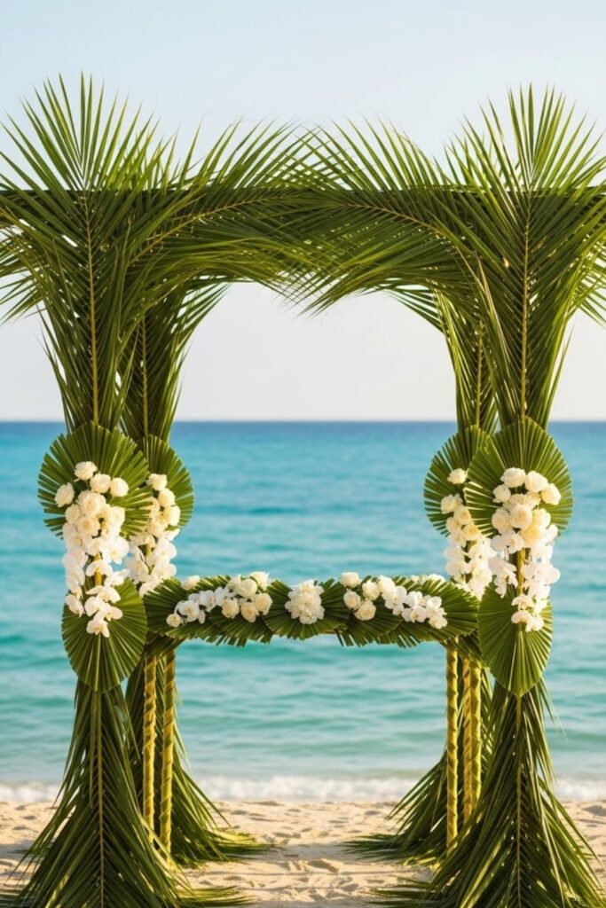 Tall palm leaves naturally frame your vows and replace heavy arches. You can layer them with soft white flowers or leave them simple for a clean island look.