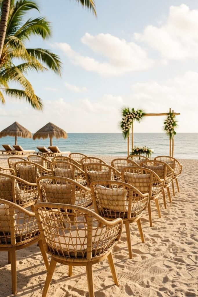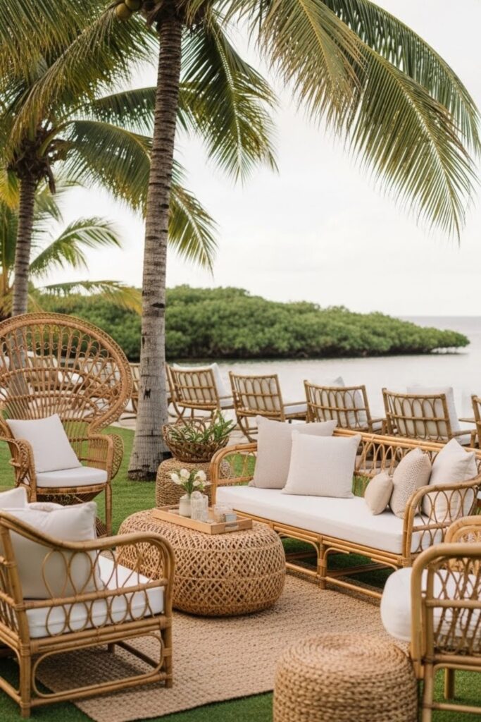 Rattan furniture works perfectly outdoors, pairing well with cushions, neutral linens, and tropical pillows for comfort and cohesion throughout the event.