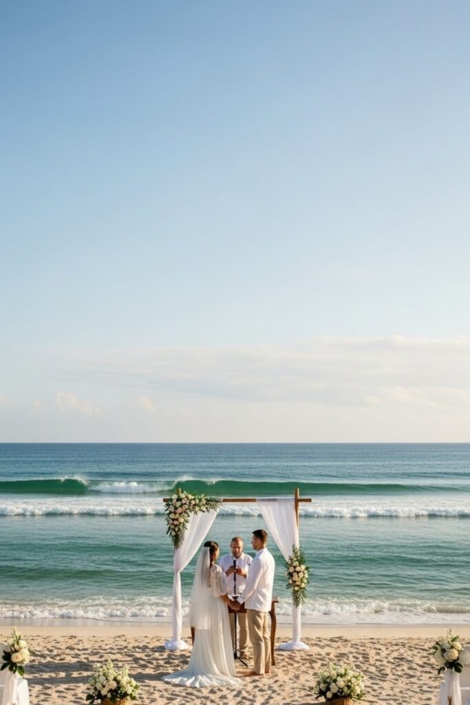 Position the ceremony so guests face the sea, allowing waves, horizon lines, and sky colors to frame your vows naturally beautifully.