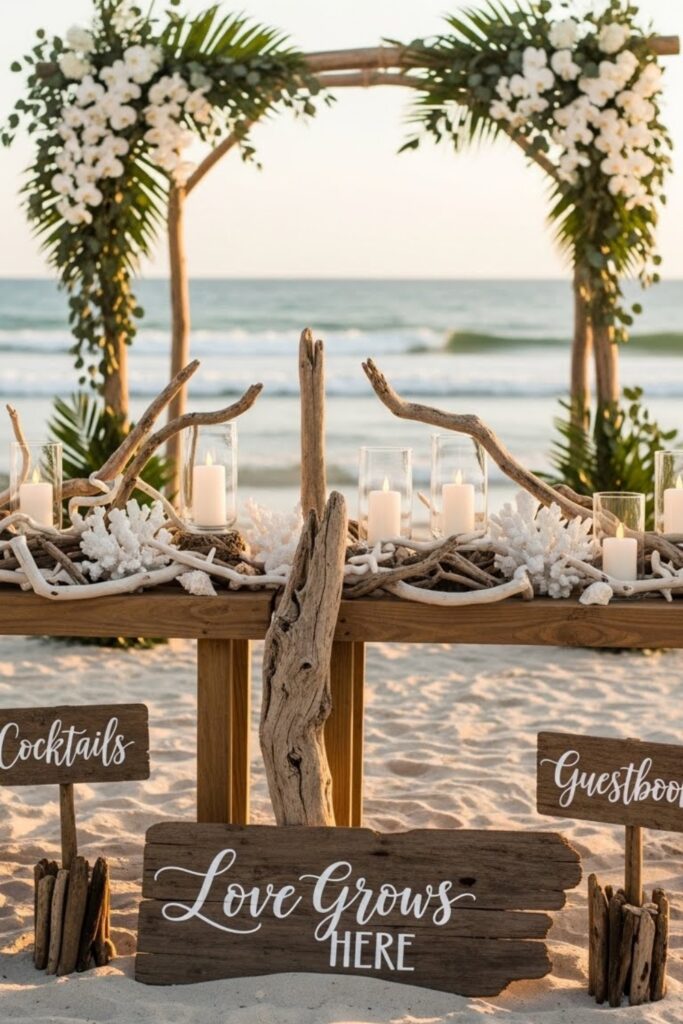 Use driftwood for signs, arches, or table accents so the design feels collected from nature, not store-bought pieces at the venue naturally.