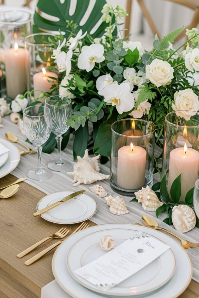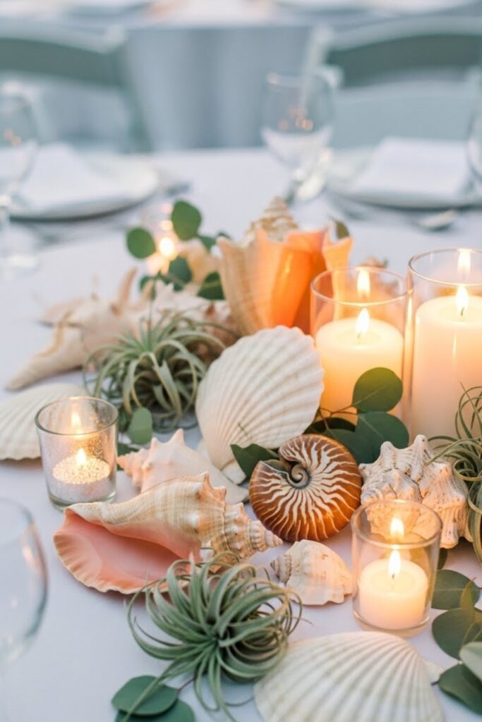 Mix shells with candles or greenery so tables feel elevated, not beachy craft projects from a souvenir shop nearby at all.