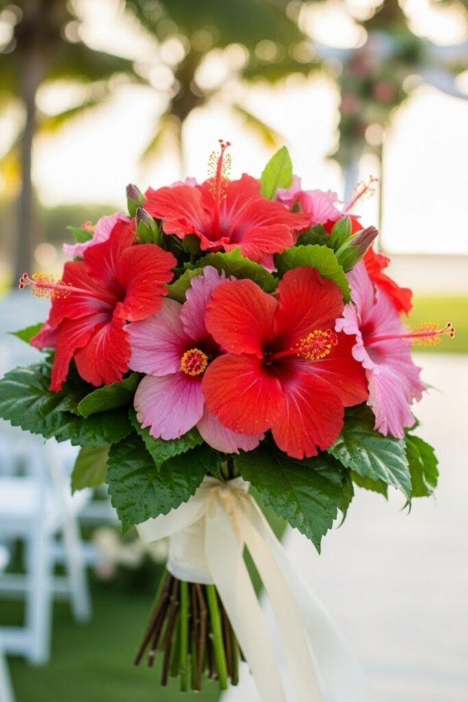 If bold color is your priority, hibiscus bouquets instantly deliver tropical energy while keeping florals simple, vibrant, and perfectly suited for warm settings.