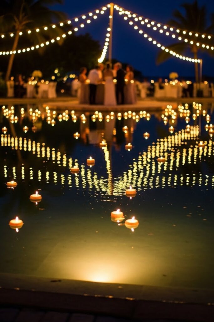 String lights, floating candles, or submerged LEDs help define spaces while keeping the mood soft and romantic for guests throughout the night.